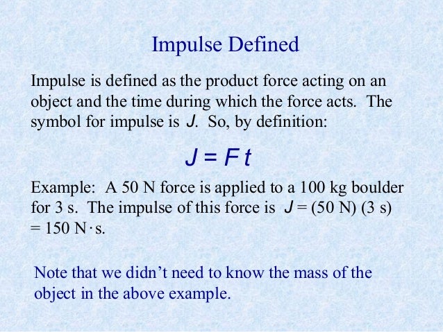 Impulse in physics is a term that is used to describe or quantify the effect of force acting over time to change the momentum of an object. In classical mechanics impulse symbolized by displaystyle j or imp is the integral of a force displaystyle f over the time interval displaystyle t for which it acts. 21 0 n s 1 0 kg m s s 1 0 kg m s.